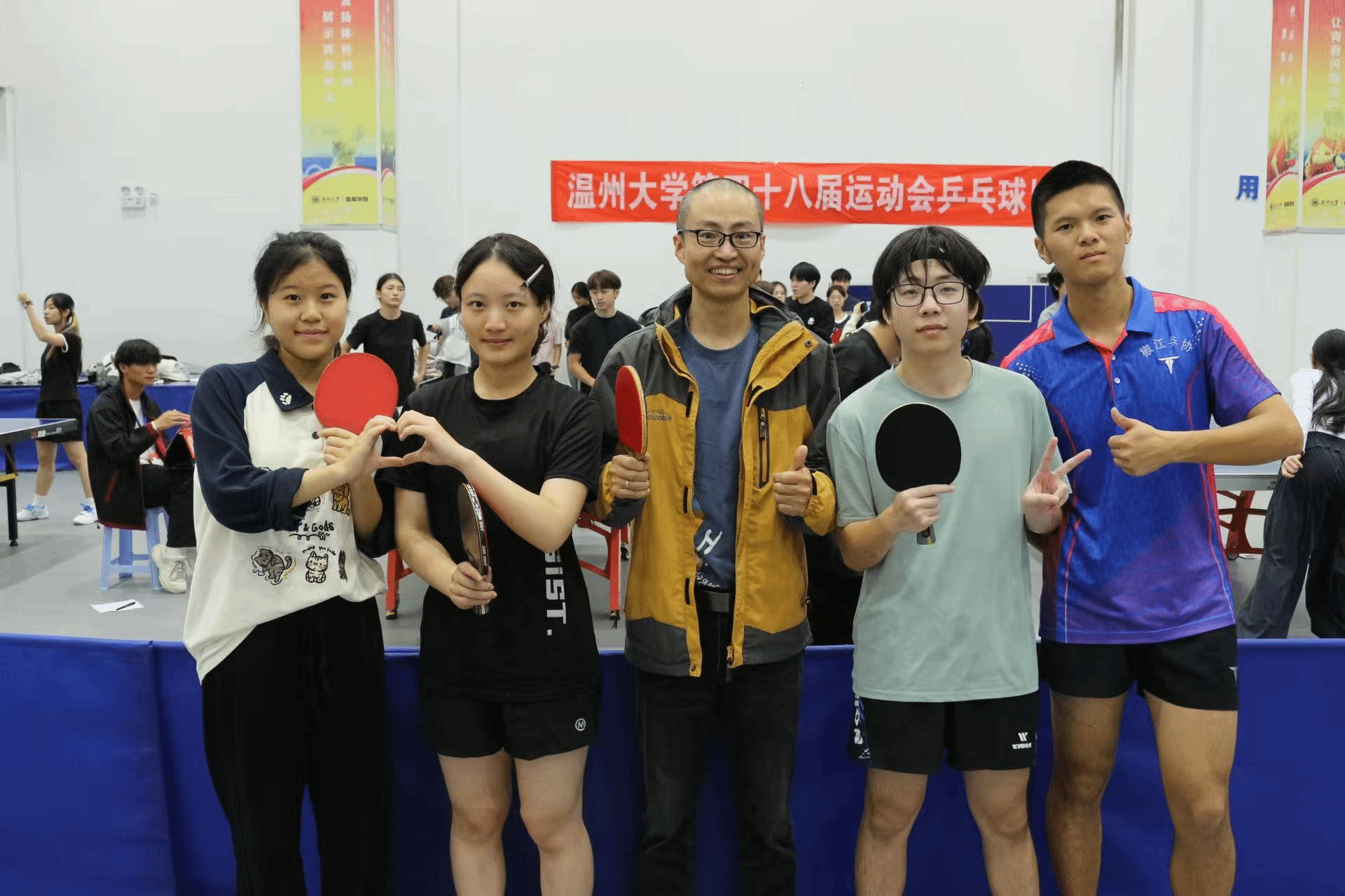 男单赛场,陈善骏、金茂凭借精准的发球和凌厉的近台快攻频频得分;女单对决中,董雅宁和齐沐辰沉着应对,灵活调整回球节奏,巧妙化解对手攻势;混双组合范文、金茂更是配合默契,在攻防转换间展现出极强的战术执行力。教练金建钰老师全程在场边悉心指导,根据赛场形势灵活调整出场阵容与战术安排;领队马羚钧细致做好后勤保障,确保队员以最佳状态投入比赛,充分展现了教育学院团队的凝聚力与向心力。