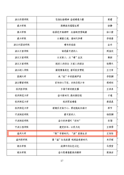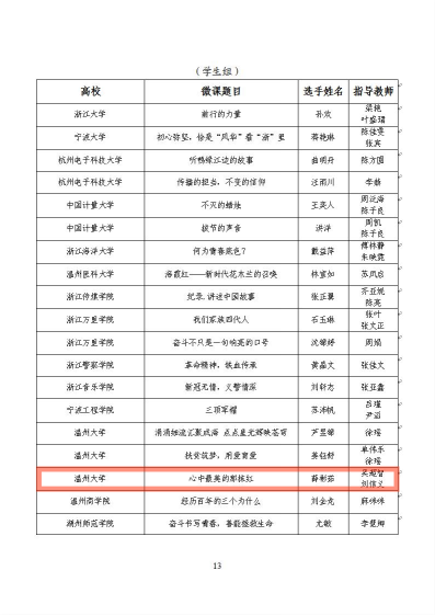 为深入贯彻习近平总书记在学校思想政治理论课教师座谈会上的重要讲话精神,贯彻落实中央、省委关于深化学校思政课改革创新的部署要求,创新打造全链条的思政育人新体系,从而进一步强化对全校青年的政治引领和价值引领,浙江省高校组织思政微课大赛,唱响主旋律、弘扬正能量、传播好声音。在该比赛中我院王恬恬老师以《“数”字新时代,“浙”里新生活》荣获2021年度浙江省思政微课比赛(教师组)三等奖,我院学子薛彬茹以《心中最美的那抹红》荣获2021年度浙江省思政微课比赛(学生组)二等奖。
