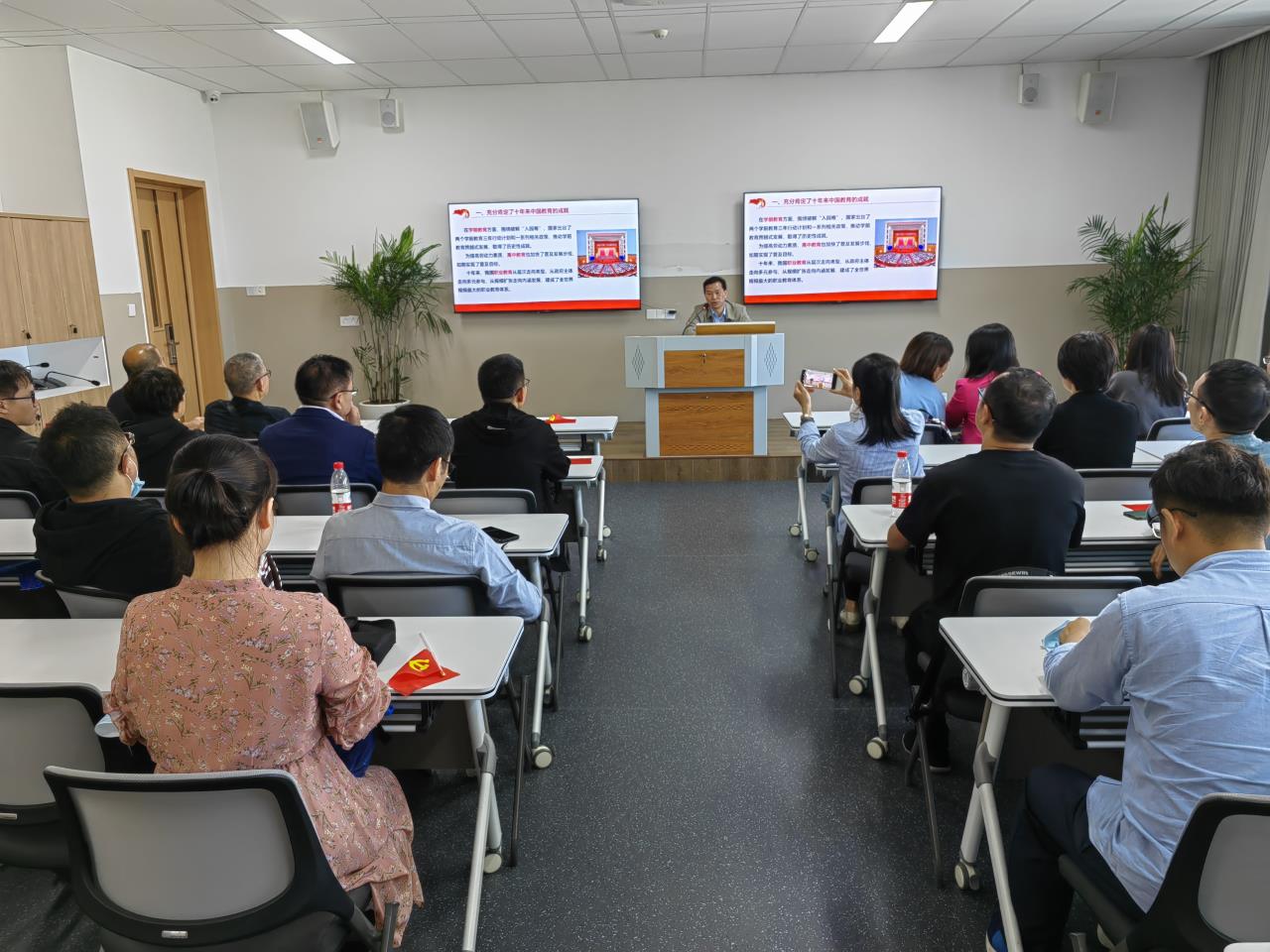 学院党委书记何毅作《学习党的二十大精神全面贯彻党的教育方针》主题发言。他从十年来我国教育取得的成就,强调教育的战略地位,重申党的教育方针,全面部署加快建设高质量教育体系,办好人民满意的教育等方面对党的二十大报告涉及到的教育元素进行了全面梳理,并结合学院发展实际对其进行了深入分析和解读。