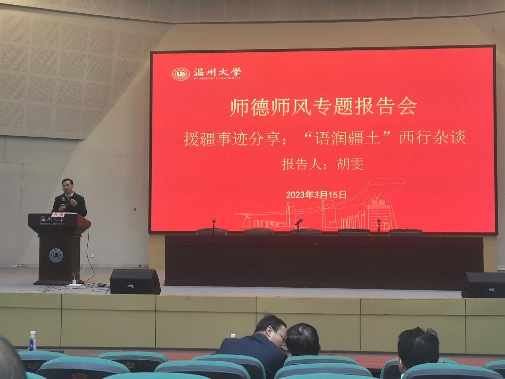 3月15日下午,教育学院举行师德师风专题教育活动,2022年底援疆归来的胡雯老师作援疆事迹专题报告。活动由学院党委书记何毅主持。