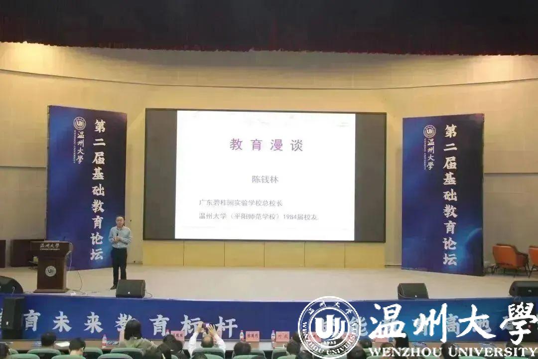 广东碧桂园教育集团区域总校长、温州市首批教育名家、浙江省第八届督学、长三角第七届最具影响力校长、温大教育学院84届校友陈钱林作《教育漫谈》主旨报告。报告从学习、立德树人、家庭教育、国际课堂以及专业成长五个方面展开。陈校长从学习的基础谈起,向与会人员分享了学习方法,并针对不同的学科提出了自己的理解;通过原创“健全人格”坐标图,陈校长提出了关于立德树人的思考。“家庭教育的本质是育人,重自律、自学、自立。”针对目前较热的家庭教育问题,陈校长强调“最好的家庭教育是亲子健身、亲子阅读、亲子探究、亲子对话、亲子共成长”;在中、西方教育的比较下,“有志向、善学习、抓机遇”对于个人成长大有裨益。与会人员互动频繁,现场气氛热烈。