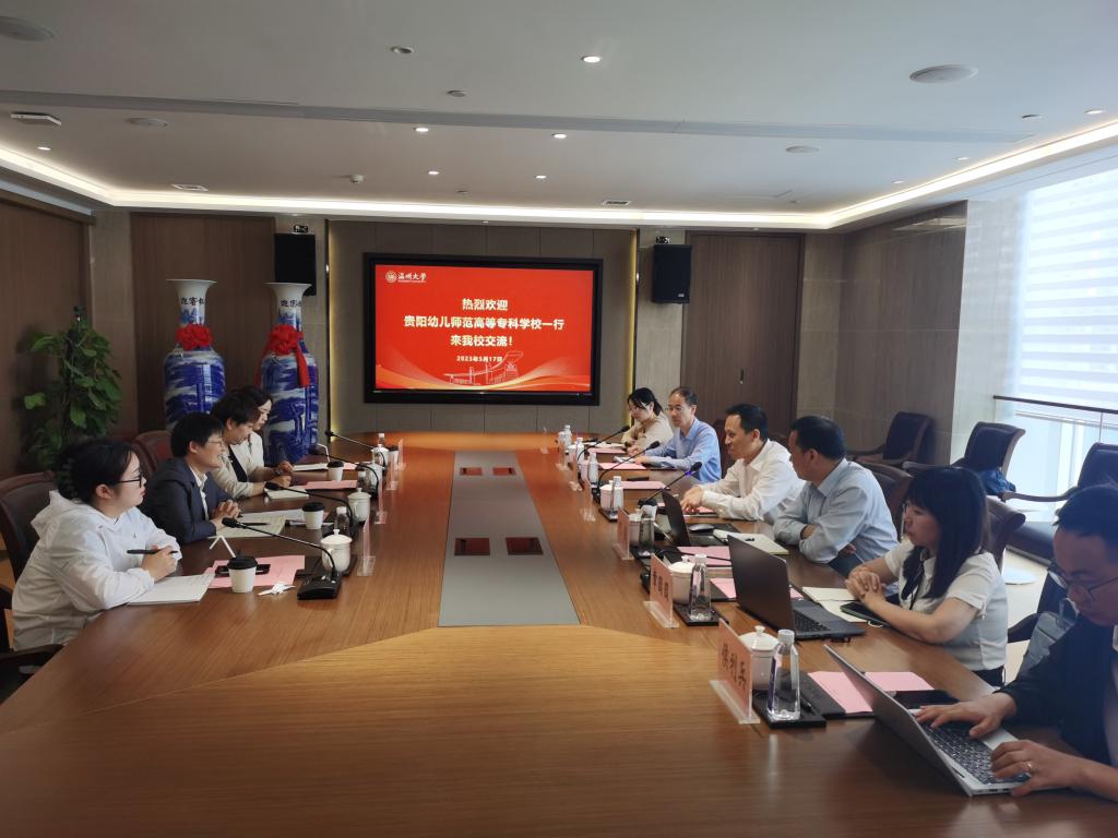 2023年5月17日上午,贵阳幼儿师范高等专科学校副校长潘丽芬带领学生处副处长戴媛媛及相关人员一行来访交流。校党委委员、副校长王舜,学工部部长张敏,教育学院党委书记何毅、党委副书记章园园,学生处超豪学区办公室主任郑光西,教育学院辅导员代表参加座谈交流。座谈交流在校友之家举行。