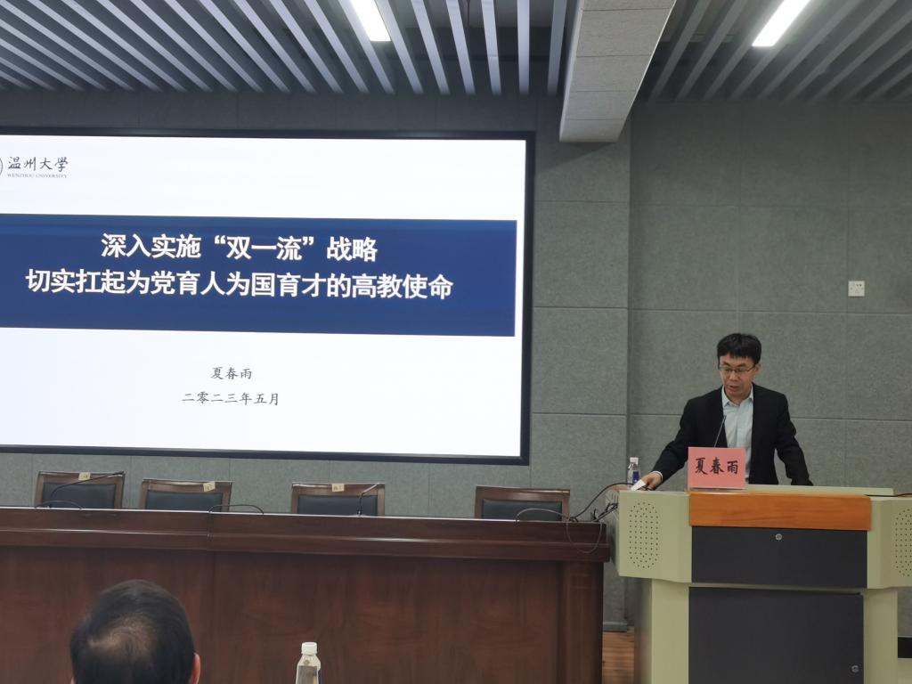 会议开展教师理论业务学习会。会议邀请校发展规划处处长夏春雨教授作《深入实施“双一流”战略 切实扛起为党育人为国育才的高教使命》报告。夏处长从“党的二十大关于教育的论述与部署”“我国‘双一流’战略的背景与基础”“我国‘双一流’战略的基本概况”“新阶段我国‘双一流’战略建设要求”“新晋‘双一流’建设高校的启示与借鉴”等五个方面展开阐述,并就7所新晋高校情况作了重点介绍。