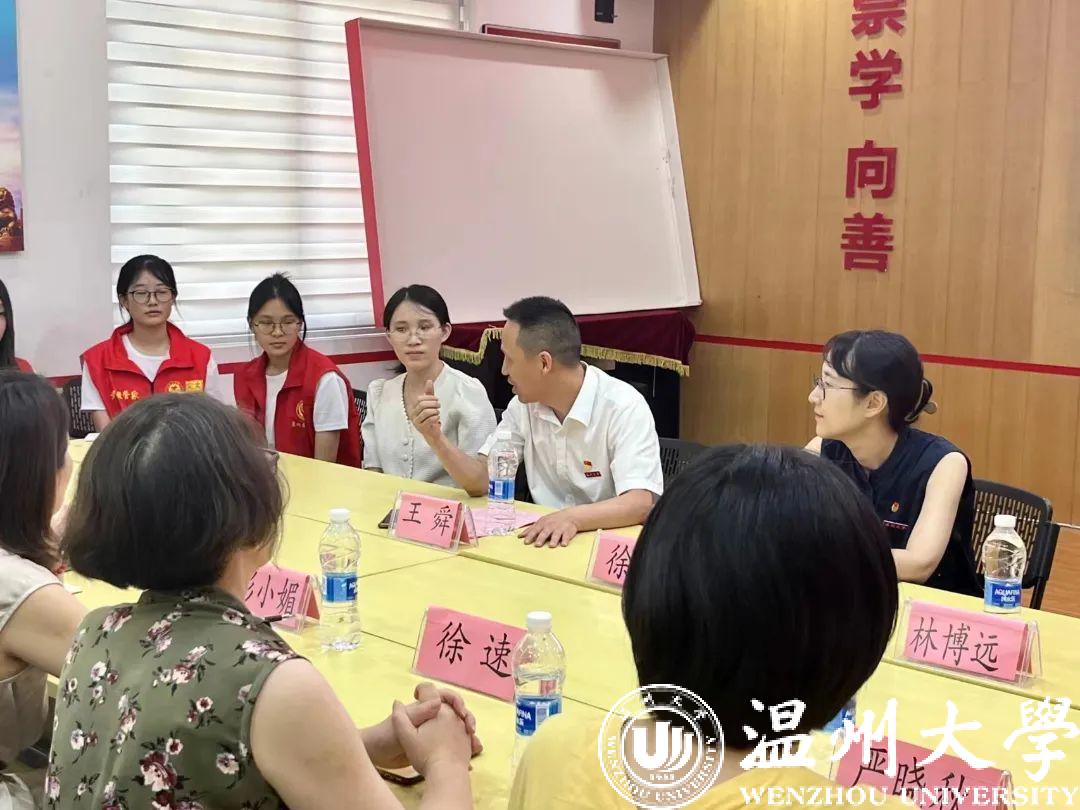 奋进红七月,服务爱先行。2023年7月14日,太阳集团tyc234cc党委委员、副校长王舜一行来到鹿城绿园社区走访慰问“智慧之花”社会实践队。实践队指导老师徐速教授、教育学院党委副书记彭小媚、校团委副书记徐瑶、教育学院学工办主任兼团委书记严晓秋、校团委办公室副主任韩新华、心理系党支部书记杜健陪同慰问,并举办了一场别开生面的座谈会,为“智慧之花”实践队之旅添上了浓墨重彩的一笔。绿园社区支部副书记金方圆等热情接待王舜副校长一行。