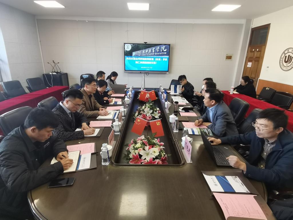 2023年11月17日上午,台州学院教师教育(体育)学院张夫伟院长、吴银银书记一行六人来我院调研交流。学院院长李长吉、党委书记何毅、副院长叶新东及相关老师参加座谈交流会。