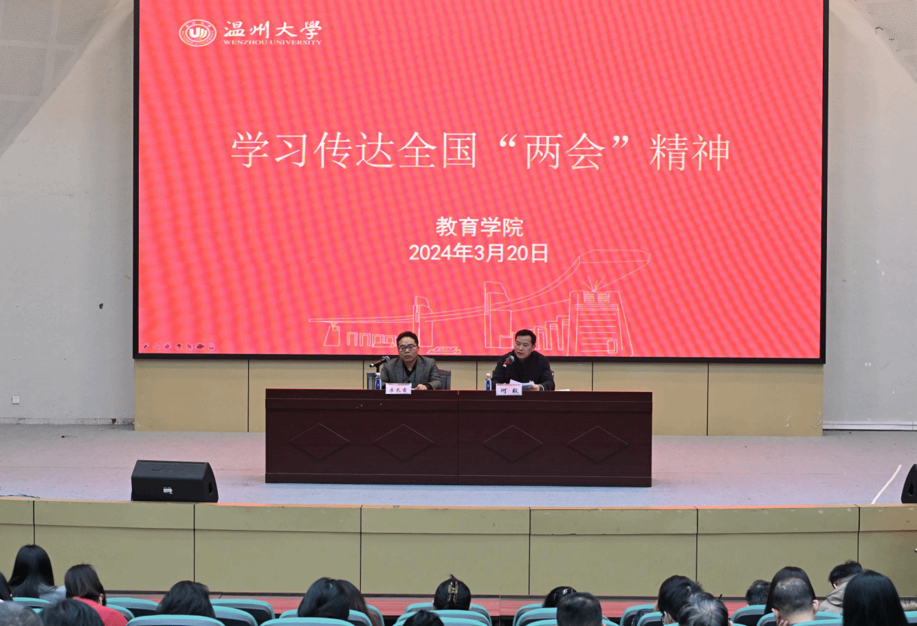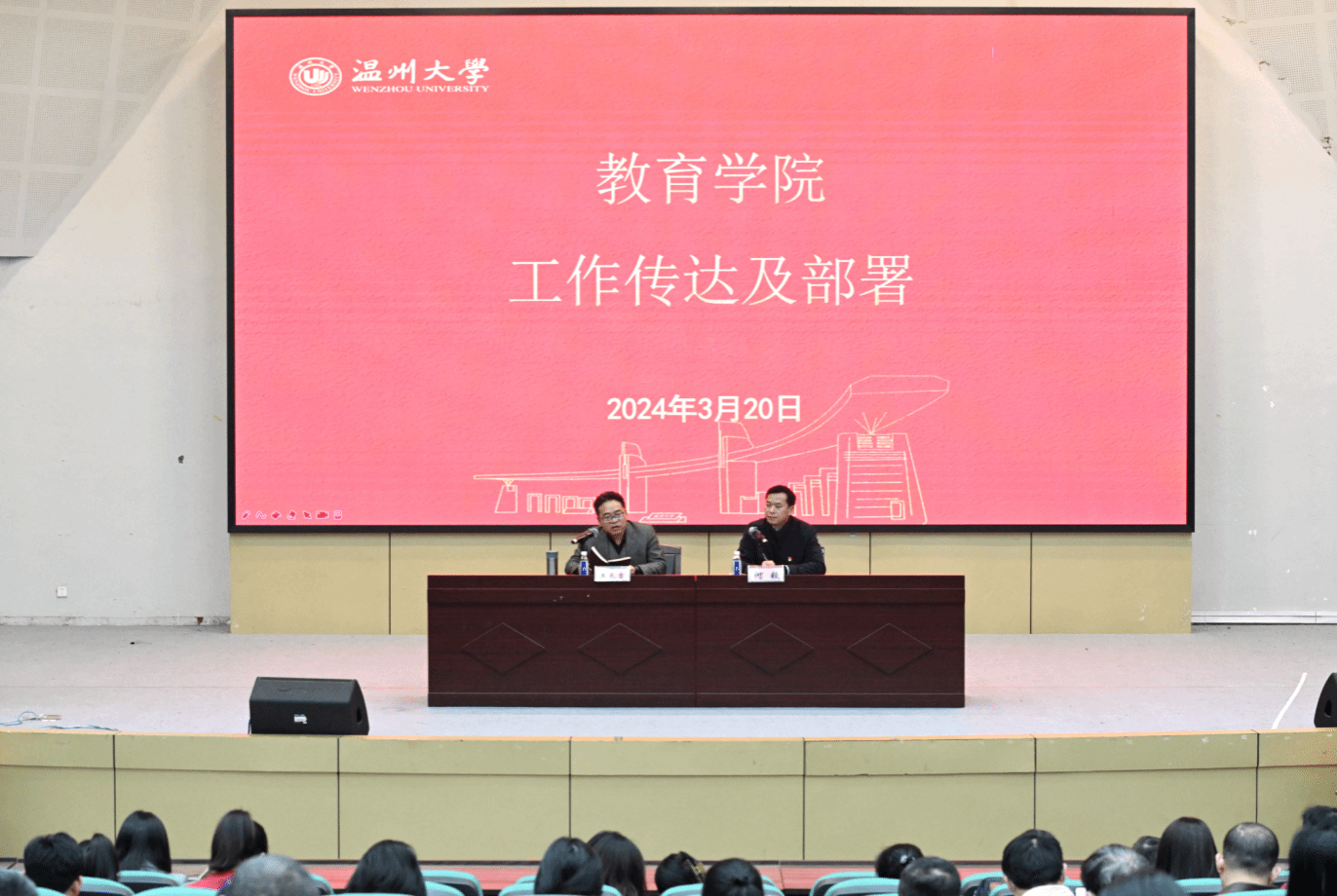 3月20日下午,教育学院在南校区9号楼一楼报告厅召开教职工大会学习传达全国“两会”精神,并开展师德师风专题教育。学院领导班子及全体教职员工参加本次会议。会议由学院党委书记何毅主持。