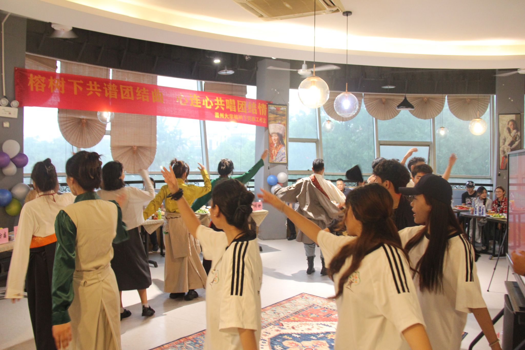 夜幕降临,晚上的“榕·宴团圆”庆祝活动更是精彩纷呈。在热闹的长桌宴上,维吾尔族、藏族、蒙古族、回族、畲族等50余名少数民族学生与领导嘉宾、老师们围坐一圈,他们身着鲜艳的少数民族服饰,分享各民族特色美食、一起畅谈家乡民族风俗。来自不同民族的学生代表身着节日盛装,纷纷走上舞台,用优美动人的民族特色舞蹈和悠扬婉转的歌声,向在场师生们展示了多元文化的魅力。现场气氛热烈而温馨。来自藏族的桑宗同学感慨道“今天的活动让我感受到了家一般的温暖,作为新时代青年,让我们像石榴籽一样紧紧相依、紧密相连,共同绽放出属于我们色彩!”