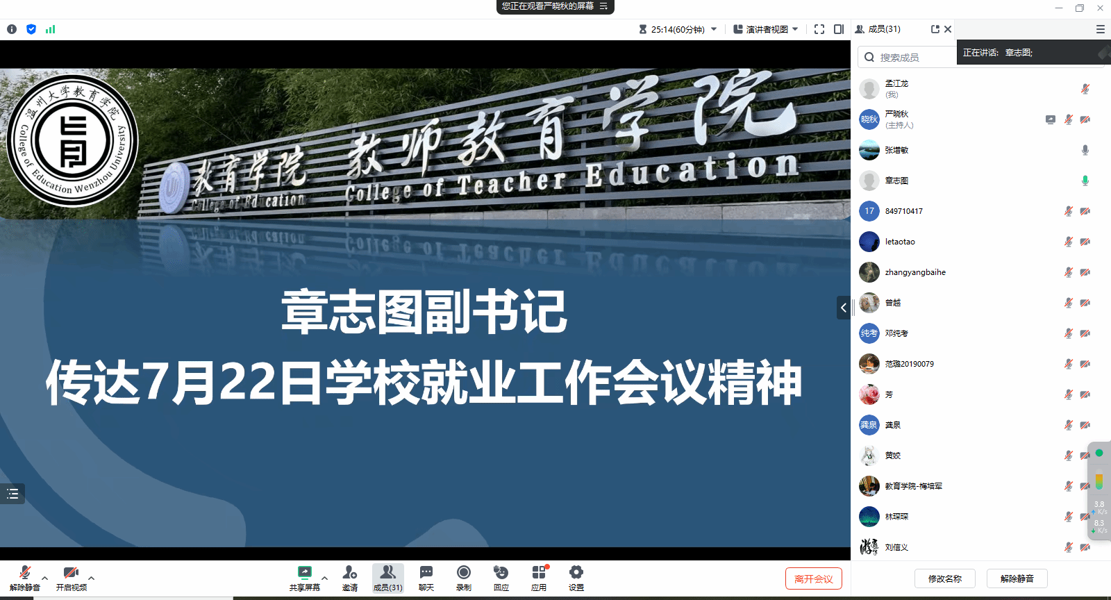 为进一步提升就业工作质量,切实做好2024届毕业生就业工作,7月23日,教育学院在线上召开毕业生就业工作专题研判会。学院领导班子全体成员,各系主任书记,2024届毕业班班主任及毕业班辅导员参加会议。