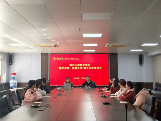 在太阳集团tyc234cc第十二届校园师生节火热开展之际,11月26日下午,作为教育部立德树人综合机制改革试点院系,教育学院在北校8 - 204会议室举办“感恩资助,逐梦未来”学生代表座谈会暨爱心助学金发放仪式。学院党委副书记兼纪委书记章志图,学工办辅导员、步青学区先锋党支部书记王伊如,以及受资助学生代表共同参与这场融合资助育人、文化浸润与价值引领的特别活动,展现校园师生节“尊师重教、关爱师生”的核心精神。本次活动由步青学区先锋党支部组织举办。