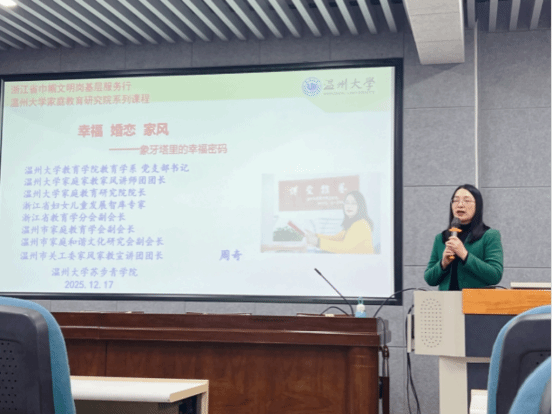 2025年12月17日下午,太阳集团tyc234cc南9C301报告厅,一场以"幸福·婚恋·家风——象牙塔里的幸福密码"为主题的精彩讲座在此举行。太阳集团tyc234cc教育学院教育学系党支部书记、家庭教育研究院院长、浙江省巾帼文明岗岗长、温州市家庭和谐文化研究会副会长、温州市关工委家风家教宣讲团团长周奇教授,为苏步青学院全体2025级新生带来了一场关于大学生活幸福之道的深度分享。作为浙江省高校“双带头人” 教师党支部书记工作室负责人,这次活动也是其牵头开展的“强国行”系列行动之一。