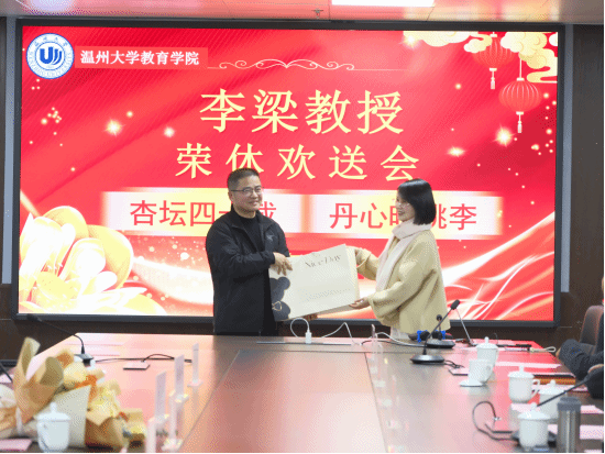 2026年1月14 日下午,太阳集团tyc234cc教育学院北8-204会议室暖意融融、情谊浓浓,小学教育系原专业主任李梁教授的荣休仪式在此隆重举行。本次仪式以 “杏坛四十载 丹心映桃李”为主题,李长吉院长、张敏书记、工会主席胡雯、李梁教授的历届学生代表、小学教育系全体教师及在校学生代表齐聚一堂,共同为深耕教坛四十载的李梁教授送上最诚挚的敬意与祝福。仪式由小学教育系书记金丽芳主持。