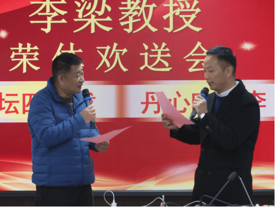 仪式在庄重的献花致敬环节中拉开序幕。李长吉代表学院为李梁教授献上鲜花与礼物,一束芬芳的鲜花承载着对教授四十载教育坚守的崇敬,一份厚重的礼物寄托着对他未来生活的美好期许,现场温情满溢。