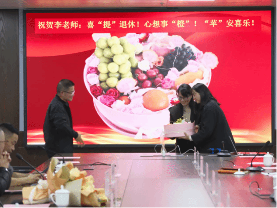 仪式现场,小学教育系的老师们还送上了亲手制作的花果篮与祝福蛋糕。手工花果篮满载着同事们的匠心与敬意,香甜的蛋糕寄托着对李梁教授退休生活甜甜蜜蜜、平安喜乐的美好祝愿,让教授感受到了系部大家庭的温暖。