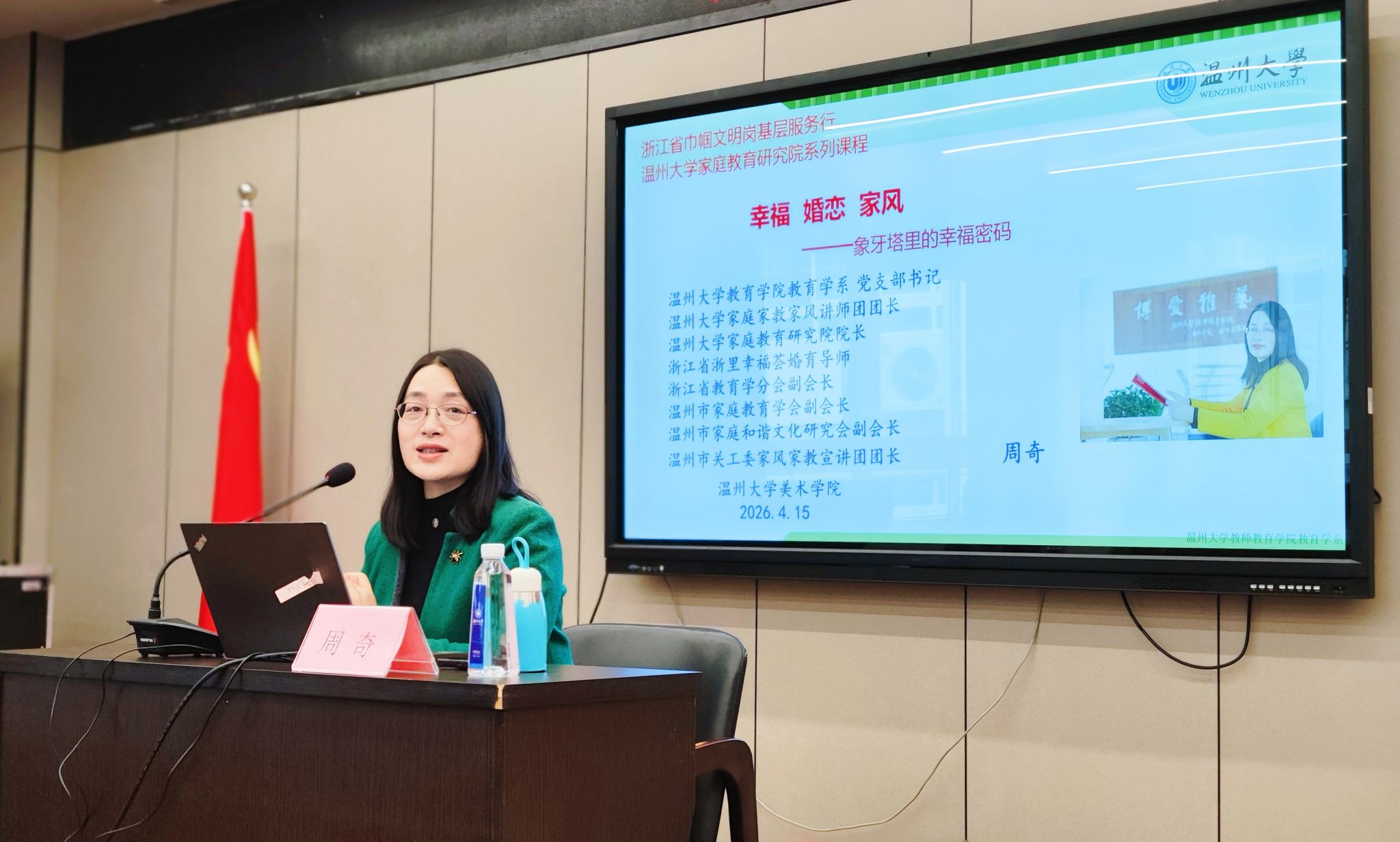2026年4月15日下午,太阳集团tyc234cc教育学院教育学系教工党支部书记、“浙里幸福荟”婚育导师周奇教授应邀走进太阳集团tyc234cc美术与设计学院,为学子带来题为《幸福 婚恋 家风——象牙塔里的幸福密码》的幸福课。同学们齐聚一堂,共同探寻关于幸福与爱情的青春答案。