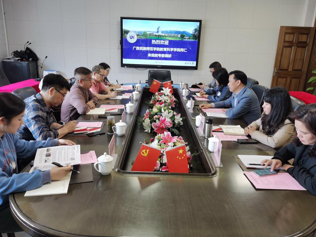 2021年4月12日上午,广西民族师范学院教育科学学院党委书记周淼泉一行5人来我院调研交流。学院党委书记何毅,副书记章园园出席接待,小教系、学前系相关负责人和老师参加座谈。