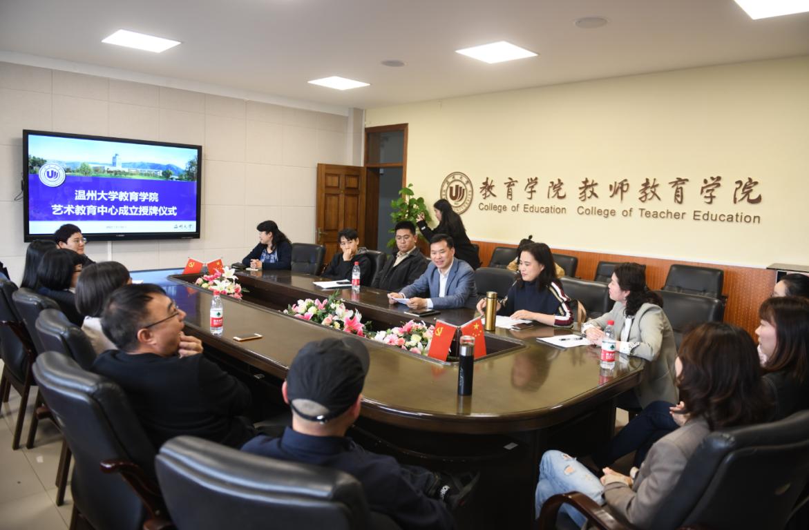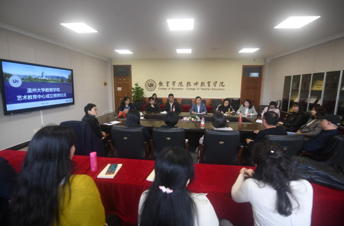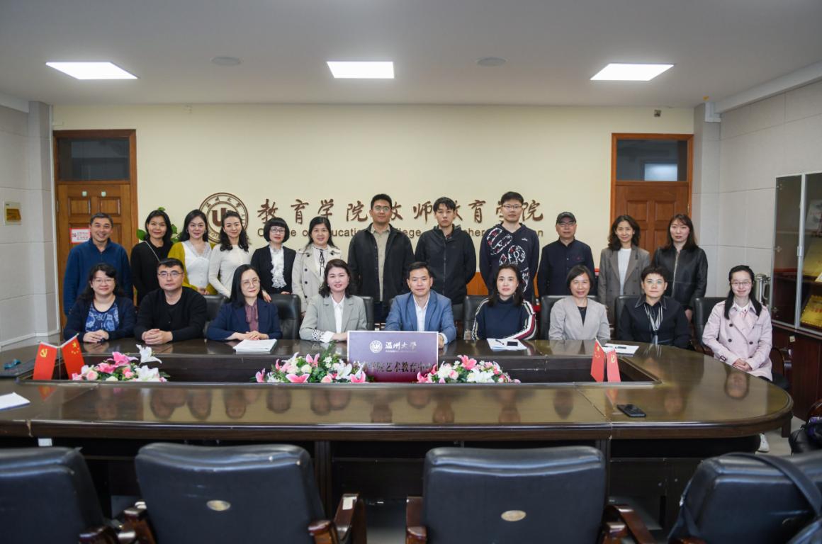 艺术教育中心陈恩清主任发言。她介绍了艺术教育中心的现状及未来的工作思路。中心的初步工作将围绕请进来、送出去、参与竞赛、服务地方等四个方面展开。中心将会邀请相关艺术专业和相关学科专家进校开展讲座和进行大师班培训;要将艺术教育中心建成优秀师资集聚的重要平台,让各位艺术教师走出去,进行交流、培训与学习;继续发扬教育学院优良育人传统,指导各项学生竞赛、大学生艺术展演等赛事,争创佳绩;鼓励支持艺术教师发挥学科专业优势,加强与中小学、幼儿园的合作,与学院继续教育工作相结合开展教师培训项目、建立儿童艺术教育培训中心。中心希望通过这些努力,致力于服务地方、促进教师自身专业成长,也能让艺术教育的声音传得更远、更具社会影响力。