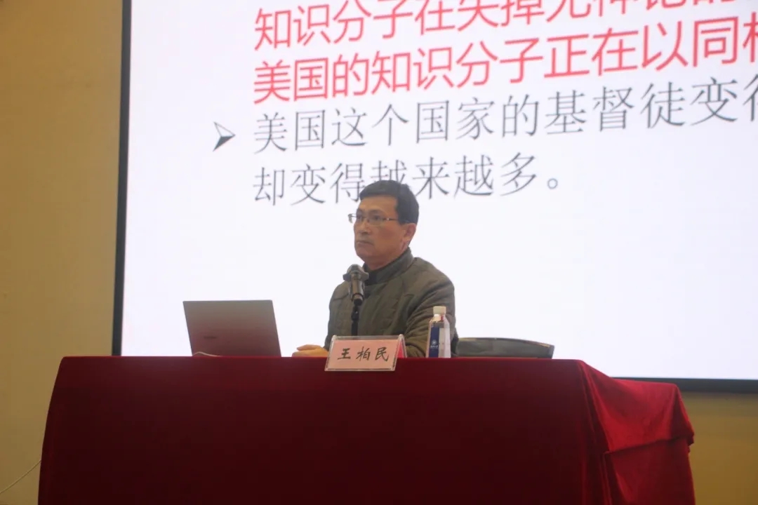 太阳集团tyc234cc马克思主义学院党委书记兼副院长王柏民的课程以“马克思主义宗教观”为主题”,从世界宗教的分布图、21世纪宗教发展趋势、中国公民信仰宗教现状、当前我国宗教工作形势这四个方面总结我国目前的宗教现象,讲解马克思主义宗教观。王书记围绕着马克思主义宗教观的哲学基础、基本内容和中国化依次展开,向同学们深度地解读了马克思主义哲学以及宗教的概念、产生、发展、社会作用等。