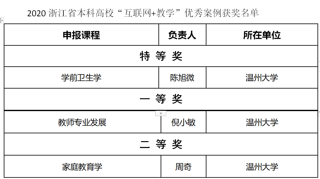 近日,浙江省高等教育学会公布了2020浙江省本科高校“互联网+教学”优秀案例获奖名单,我院3门课程案例获奖,分别是陈旭微教授《学前卫生学》、倪小敏教授《教师专业发展》、周奇教授《家庭教育学》。