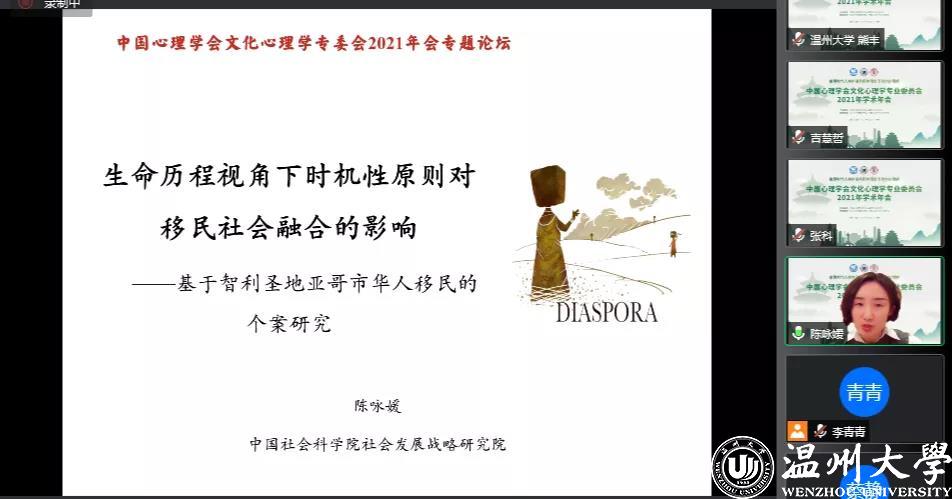 11月27日下午和晚上,大会进行了专题论坛和研究生论坛。专题论坛由中国人民大学心理学系副教授韦庆旺和中国社会科学院社会发展战略研究院陈咏媛博士主持,专题内容主要围绕文化与道德心理、青年文化认同与文化态度、华侨华人文化心理、幸福感与社会适应主题展开。研究生论坛围绕文化心理、疫情相关研究、学校心理学主题展开。专家学者们介绍了自己研究领域的最新成果,探讨文化心理学发展之路,对推动相关领域研究具有积极意义。