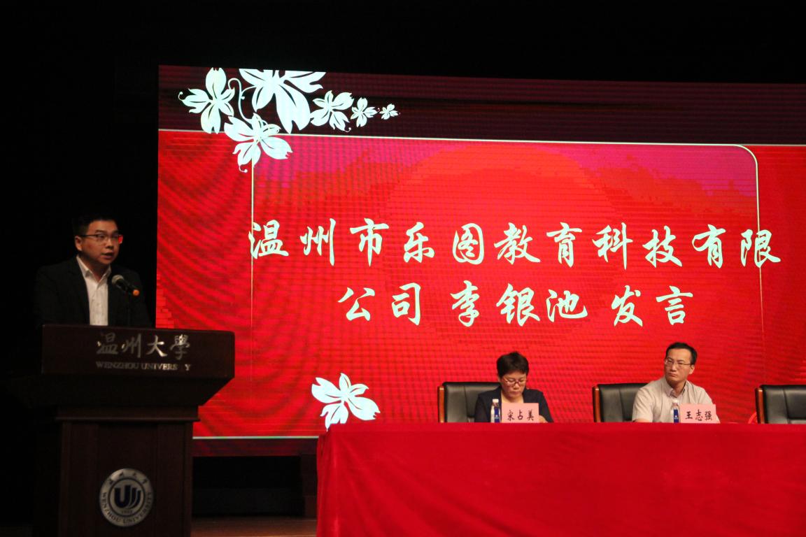 温州市乐图教育科技公司总经理李银池致辞。他简要介绍了柳瑛女士在太阳集团tyc234cc的求学经历,以及离开学校后怀揣着教育梦走上创业之旅的过程;表达了温州市乐图教育科技公司一直以来热心教育、服务大众的公益之心,并说明了此次捐资助学的初衷和愿景。