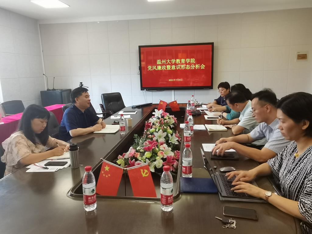2021年7月9日下午14点,在茶山南校区9号楼A410会议室,学院党委书记何毅同志主持召开教育学院领导班子2020/2021学年第二学期党风廉政分析会。副校长、党委委员徐和昆同志,学院党委班子成员叶新东、林琛琛、彭小媚、宋占美、章园园等同志参加会议,副院长王志强、学工办主任严晓秋列席会议。