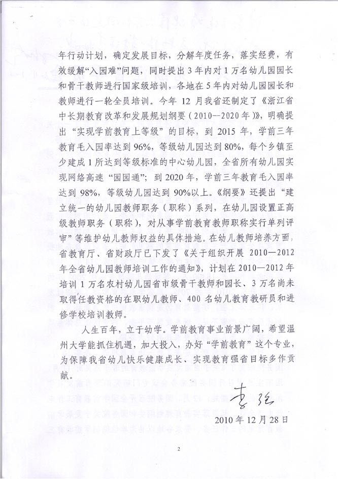 2010年12月10日,省委常委、省委秘书长李强同志莅临我校为师生作形势报告时,我院08学前本科沈雅山同学提出“省政府对学前教育教师如何培养?学前教育的长远发展有哪些政策?我省学前教育发展要达到什么样的水平”等问题,引起李强秘书长的高度重视。12月28日,李强秘书长专门致信我校就这个问题给予书面答复。1月6日,校党委陈福生书记专门给予批示。