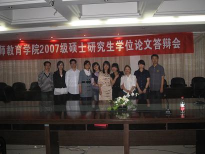 心理组由曹立人教授主持;教育、计算机组由盛群力教授主持,他们首先介绍了答辩委员会成员和答辩的学生,其次,说明了答辩的程序,然后研究生按之前的抽签顺序依次进行研究阐述,阐述完毕,第一个同学开始回答问题。整个答辩过程,气氛融洽,张弛有度,持续了一下午。最后心理组曹立人教授郑重地宣布我院07级研究生任强同学、孙洲同学、田晓霞同学、符自萍同学顺利通过答辩;教育、计算机组盛群力教授郑重地宣布我院07级研究生王亚卓同学、李璐同学、齐晶莹同学、李家德同学、祝成林同学顺利通过答辩。