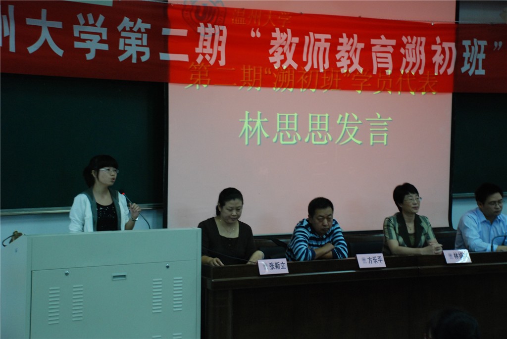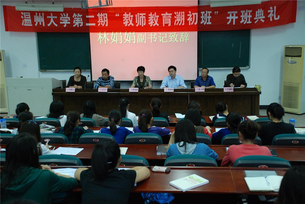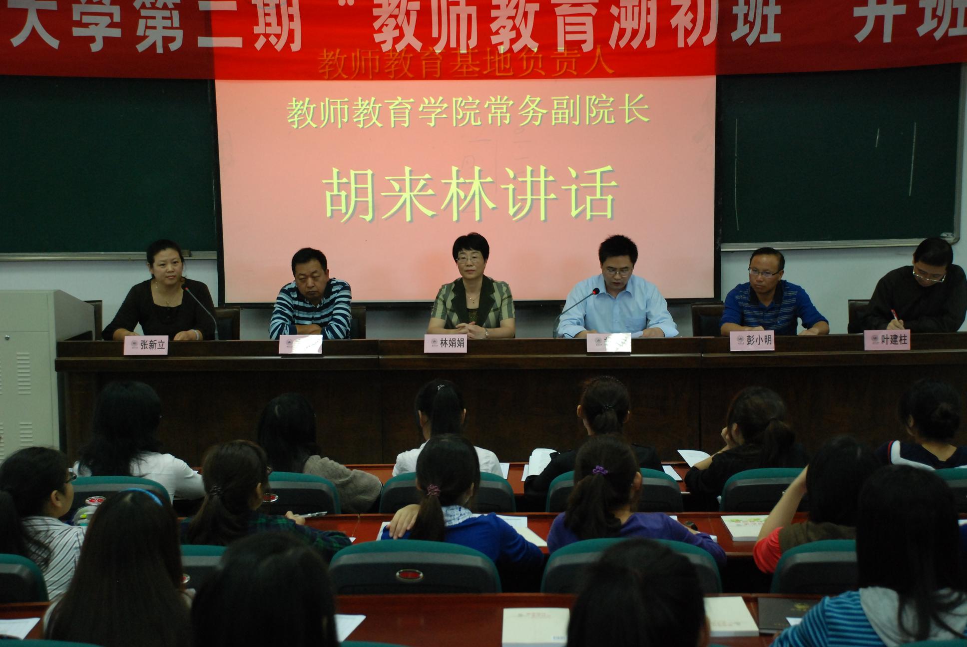 秋风送爽,丹桂飘香。在这美好的季节里,太阳集团tyc234cc第二期“教师教育溯初班”开班典礼隆重举行。2010年10月13日下午,在北校区教育楼101教室,太阳集团tyc234cc党委副书记林娟娟、教务处方乐平副处长、张新立副处长、教师教育基地负责人、太阳成集团tyc234cc常务副院长胡来林教授、第一期“溯初班”班主任彭小明教授、第二期“溯初班”班主任叶建柱教授等领导主席台就座,“溯初班”第一、二期全体学员参加了这一开班典礼。