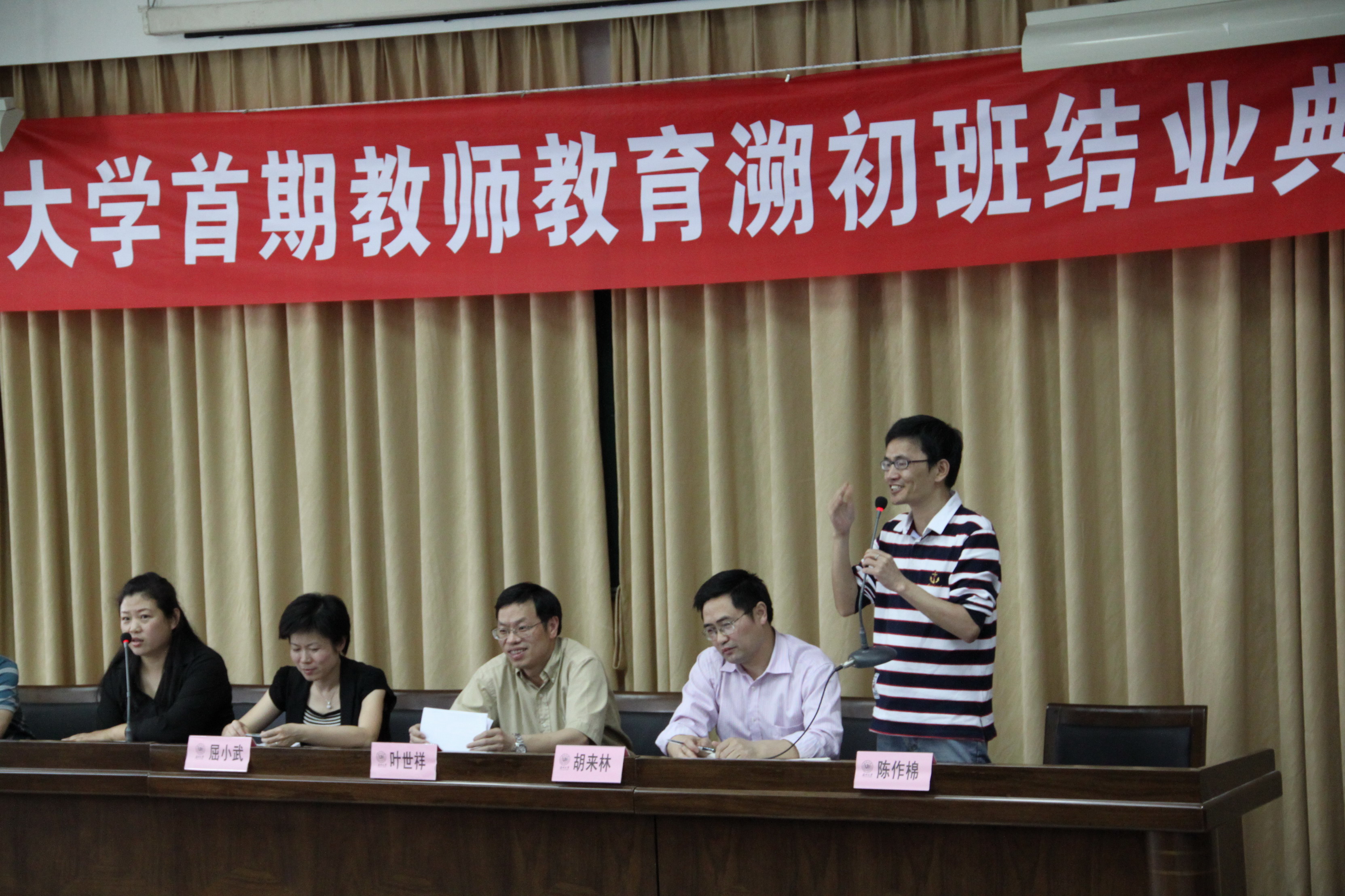 2011年5月20日下午2:00,在北校区教育楼101室,我校举行了太阳集团tyc234cc首期“教师教育溯初班”结业典礼。太阳集团tyc234cc副校长叶世祥教授、太阳集团tyc234cc教师教育基地负责人胡来林教授、教务处副处长张新立、首期“溯初班”班主任、太阳成集团tyc234cc彭小明副院长、温州实验中学副校长屈小武、温州中学省特级教师陈作棉老师以及部分“溯初班”校内导师出席了今天的结业典礼。结业典礼由张新立处长主持。