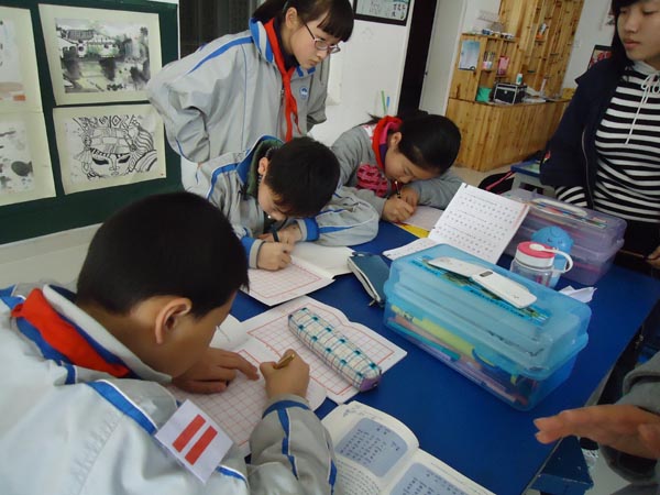 3月16日下午,“知心姐姐”名校学生服务小分队再次前往瓯海实验小学,和小学生们进行了精彩难忘的“知心面对面”活动,与该校的小学生进行了心灵上的沟通,了解他们的生活和学习方面的事情。小学生们对此表现十分活跃,双方交流地十分愉快。除了必要的心理辅导外,“知心姐姐”们还发挥自己的专长,为小学生们提供钢笔字、毛笔字等技能的辅导,手把手的教小学生们练习写字,有的“知心姐姐”还拿出自己的作品做范本,通过讲解字型的特征来促进学生对书法的理解。