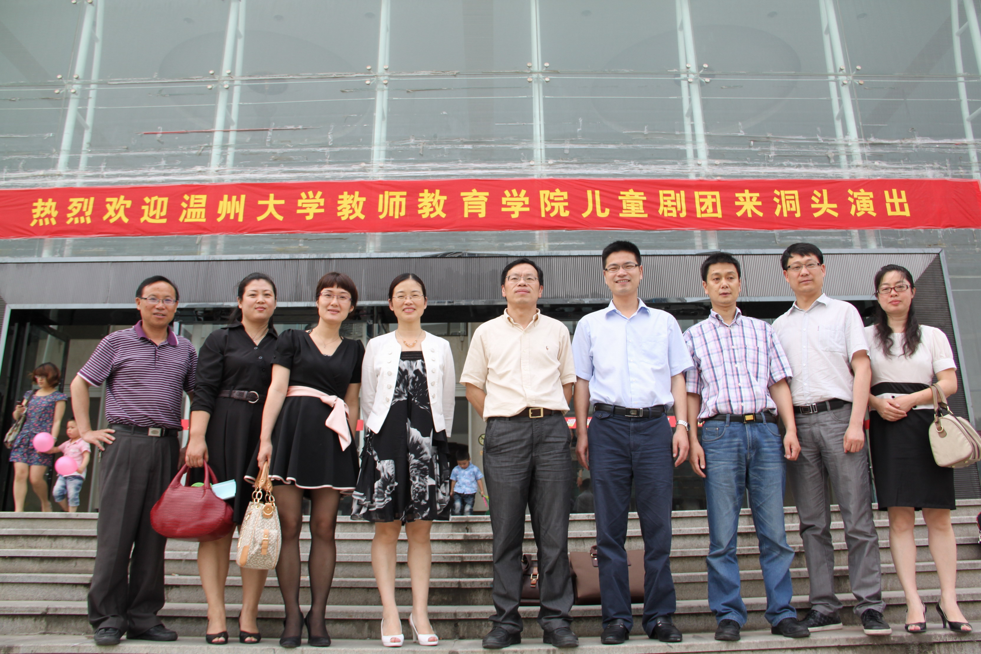 在签约仪式举行的同时,我院学前教育系第三届“讲给孩子们听的故事”童话剧巡演正在洞头剧院上演。“童话剧”进海岛是双方这一创新行动计划的具体合作项目之一。这次演出也标志着这一行动计划的正式启动。值得一提的是,这次洞头演出是我院童话剧第一次走出市区送戏下乡。演出现场可谓盛况空前,据洞头教育局领导介绍,剧场内坐了2000多名儿童和家长。在演员与观众互动时,孩子们的声音几乎掀掉剧场顶。演出结束后,参加签约仪式的双方领导上台慰问了演职人员并合影留念。