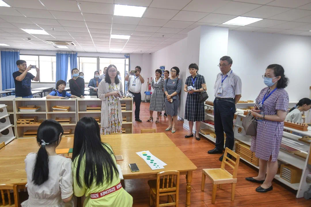 随后,专家组来到了北校区6号楼教育学院实验教学中心3楼,首先走访了奥尔夫教学法实验室。奥尔夫教学法实验室是以奥尔夫音乐教育体系为依托,为学前教育专业提供音乐教学、科研的基地。在实验室里,学院郑晓老师正带着同学们利用各种乐器感受音乐,氛围热情欢乐。接着,专家们又移步至蒙台梭利教学实验室,在实验室里,曹娟老师正带领同学们认真专注地使用着教具。实验室里的蒙台梭利教具包括感官教育教具、数学教育教具、语言教育教具、科学文化教育教具、日常生活教育教具及音乐教育教具等,学生在实验室里可以开展各种教学实践活动、为老师科研活动提供支撑平台等。专家组还对录音实验室、语言工作坊、书法工作坊、科学制作实验室、机器人实验室、自然科学实验室等进行了走访考察。李默老师和金建钰老师分别向专家介绍了书法工作坊的情况和自然科学探究室的情况。
