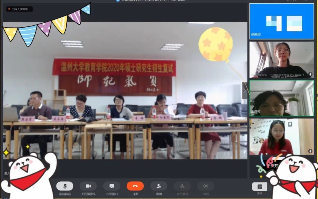 5月30日9:00—11:00,研究生(学前)线上答辩如期展开。四名答辩人在钉钉会议平台通过视频通话进行答辩,答辩过程中,学子们着装正式,语言表达流畅,就所写论文从设计的选题、研究方法、结果与分析、结论与建设等方面进行个人陈述。他们都胸有成竹,答辩时逻辑清晰、思路明确,面对答辩老师提出的问题,回答简明扼要。