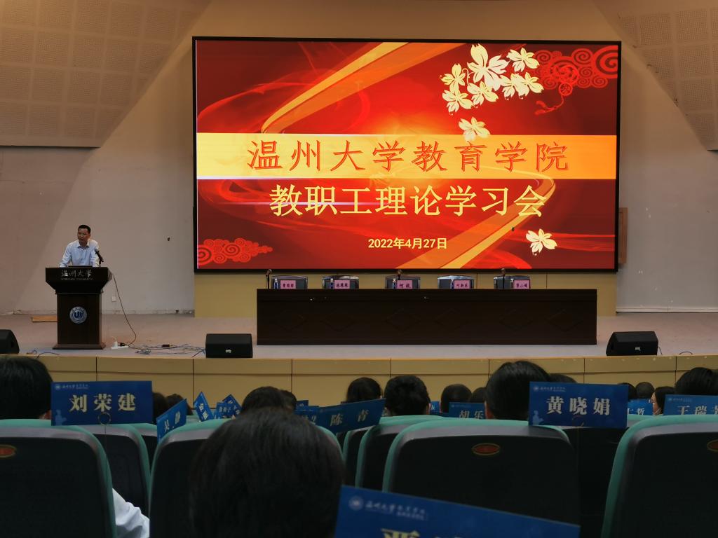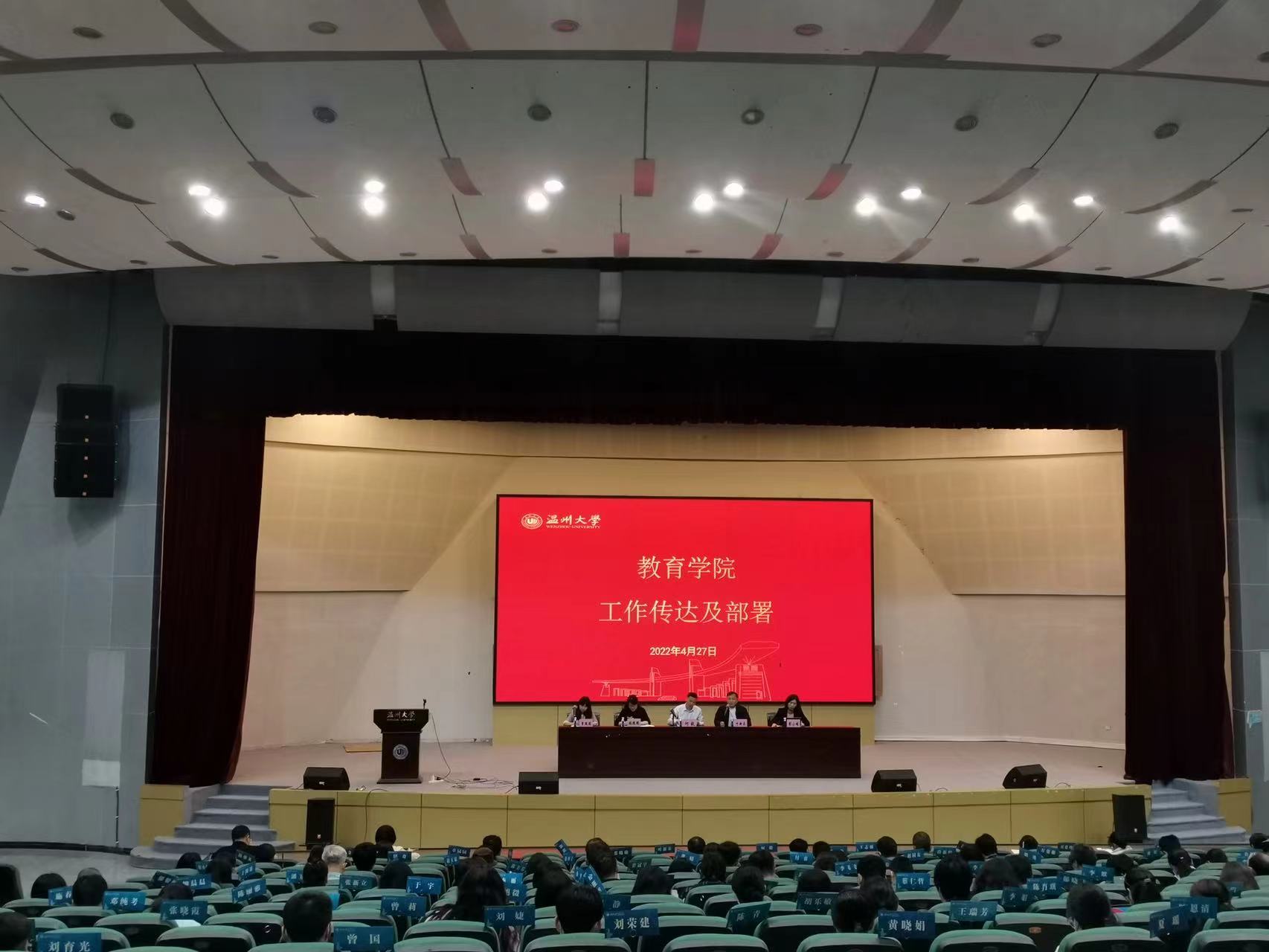 4月27日下午,教育学院教职工大会暨理论学习会在9号楼一楼报告厅举行。学院领导班子及全体教职工参加本次会议,会议由学院党委书记何毅主持。