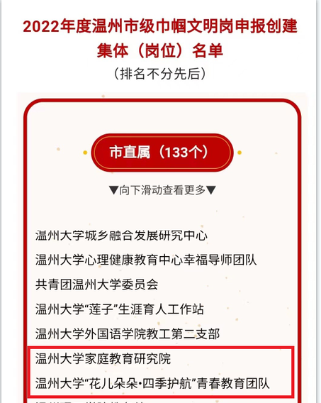 巾帼风采,榜样力量。5月11日,温州市人民政府妇女儿童工作委员会办公室公示《2022年度温州市级巾帼文明岗申报创建集体(岗位)名单》,我院两个项目荣获立项,分别是太阳集团tyc234cc家庭教育研究院和“花儿朵朵·四季护航”青春教育团队。
