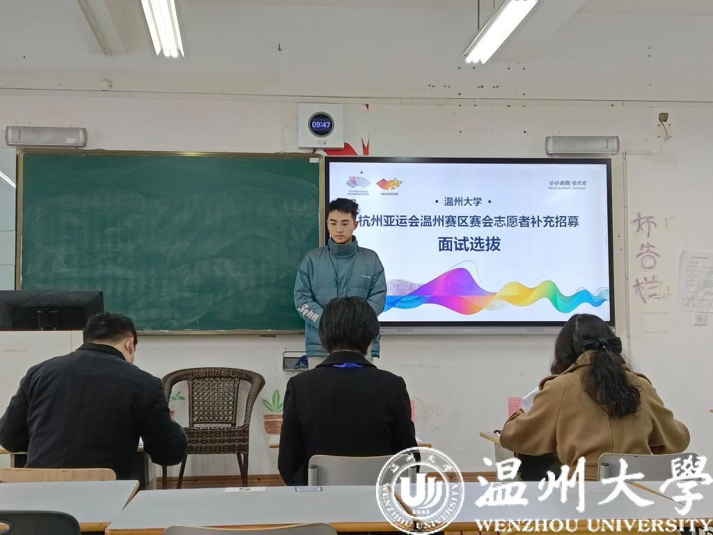 据悉,温大教育学院积极组织本次亚运会志愿者的补充招募工作,面试中注重对于学生形象礼仪、精神面貌、英语口语、综合素质等方面的考量。所选拔出的志愿者将为竞赛运行、礼宾和语言服务、观众服务、媒体运行、后勤保障、交通出行等岗位提供保障。