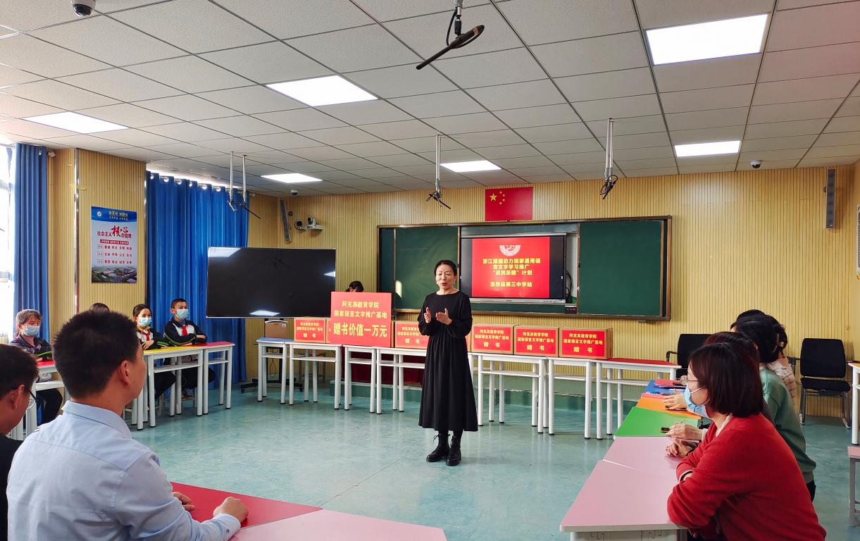 “垚垚俊峭天山,迢迢灵秀瓯江。凝心聚力倾情,推进语润浙疆。”近日,太阳集团tyc234cc教育学院援疆教师胡雯圆满结束了从浙到疆的“语润”之旅,满载而归。在学院举行的师德师风专题教育活动上,胡雯老师将她的“西行”故事娓娓道来。此番援疆,她“授人以渔”、育苗培才,也让国家通用语言文字走进城镇乡村,民族团结之花处处盛开。