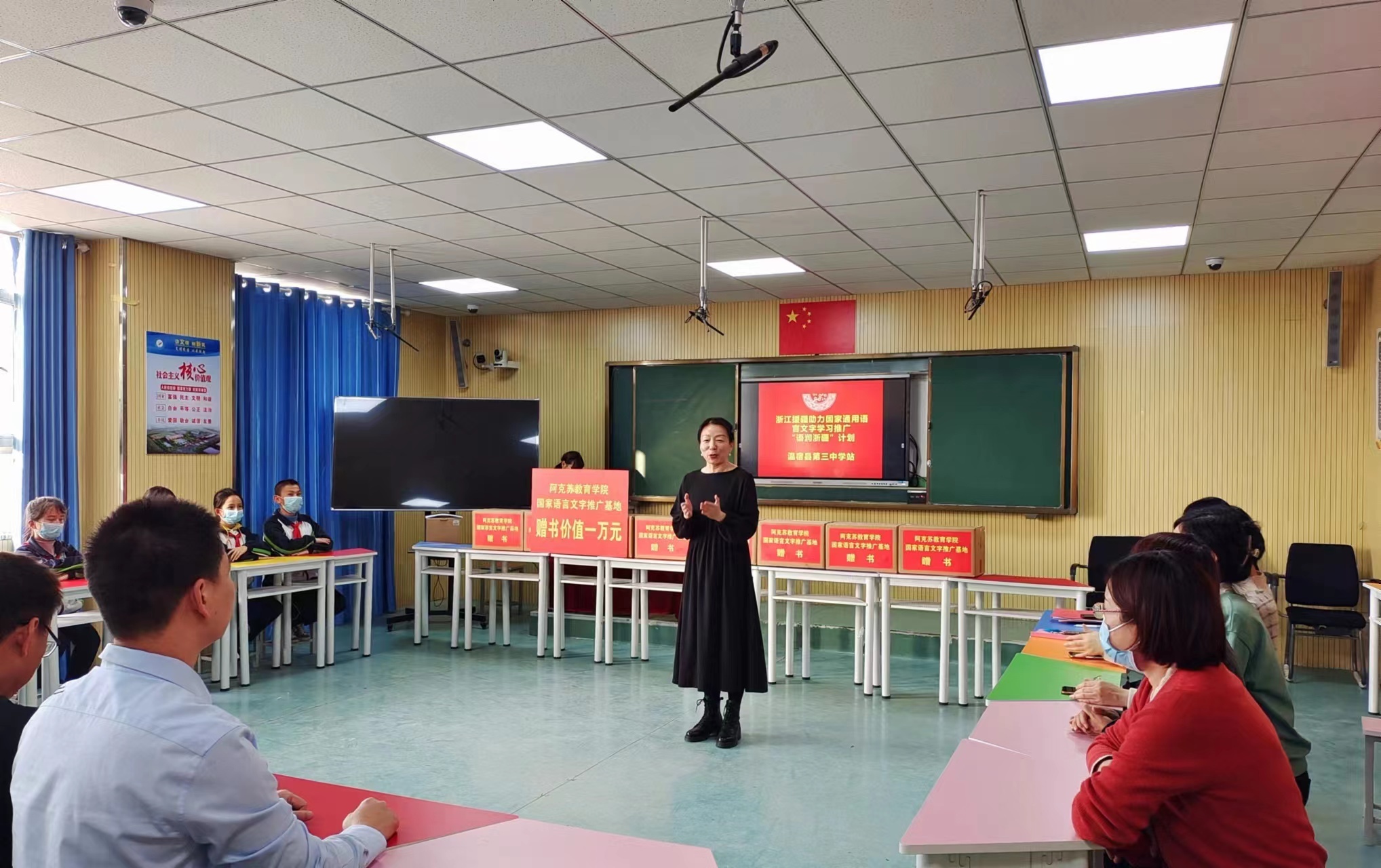 “垚垚俊峭天山,迢迢灵秀瓯江。凝心聚力倾情,推进语润浙疆。”近日,太阳集团tyc234cc教育学院援疆教师胡雯圆满结束了从浙到疆的“语润”之旅,满载而归。在学院举行的师德师风专题教育活动上,胡雯将她的“西行”故事娓娓道来。此番援疆,她“授人以渔”、育苗培才,也让国家通用语言文字走进城镇乡村,民族团结之花处处盛开。