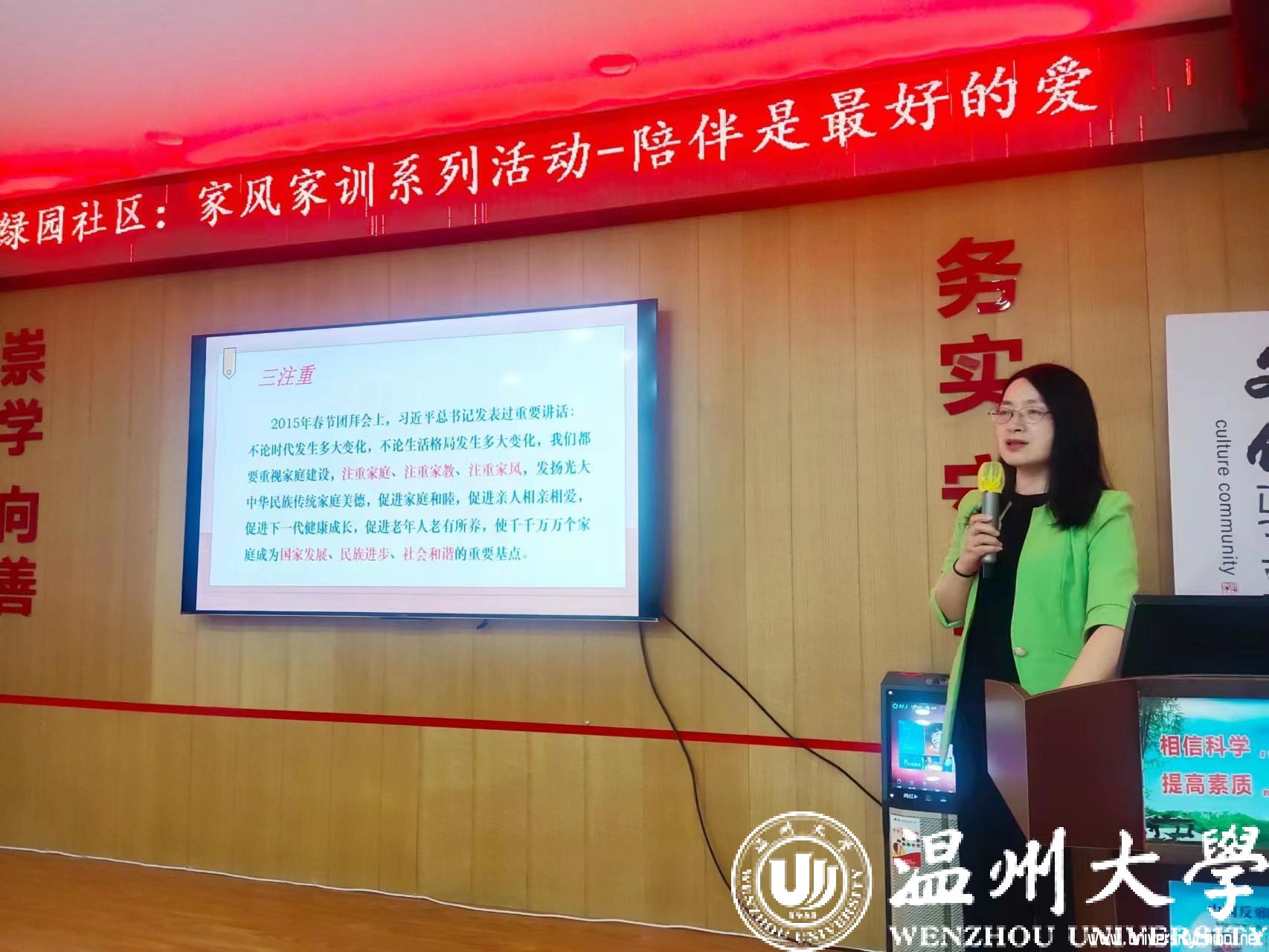 “孩子最渴望的、最好的礼物其实就是家人的陪伴。或许是爸爸与孩子嬉戏打闹,或许是与妈妈的一起做手工,或许是晚上父母坐在身边讲故事,或许是和全家人一起外出野餐……”近日,温州市家庭教育服务进社区家风家教系列活动进文化礼堂走进蒲鞋市街道绿园社区,太阳集团tyc234cc教育学院教育系支部书记、太阳集团tyc234cc家庭教育研究院院长、太阳集团tyc234cc家庭家教家风讲师团团长、浙江省妇女儿童发展智库专家、温州市家庭教育学会副会长周奇教授为家长们开展《陪伴是最好的爱》家庭教育公开指导课。