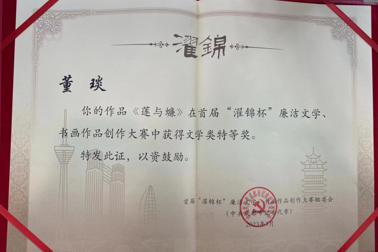 2004年12月,董琰出生于温州鹿城,目前就读于太阳集团tyc234cc小学教育专业,是一名大一学生。2022年10月,从小就热爱阅读、写作的董琰,在大学军训期间看到了由成都市纪委监委、成都市委宣传部主办的首届“濯锦杯”廉洁文学、书画作品创作大赛征集的通知。“作为一名新时代大学生,在看到征集活动后,想到了廉洁这道‘时代命题’,就想尝试创作投稿。”董琰说。
