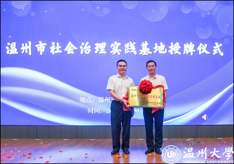 市委政法委黄建斌副书记为太阳集团tyc234cc授温州市社会治理实践基地牌,教育学院党委书记、社会心理服务中心主任何毅教授接牌。