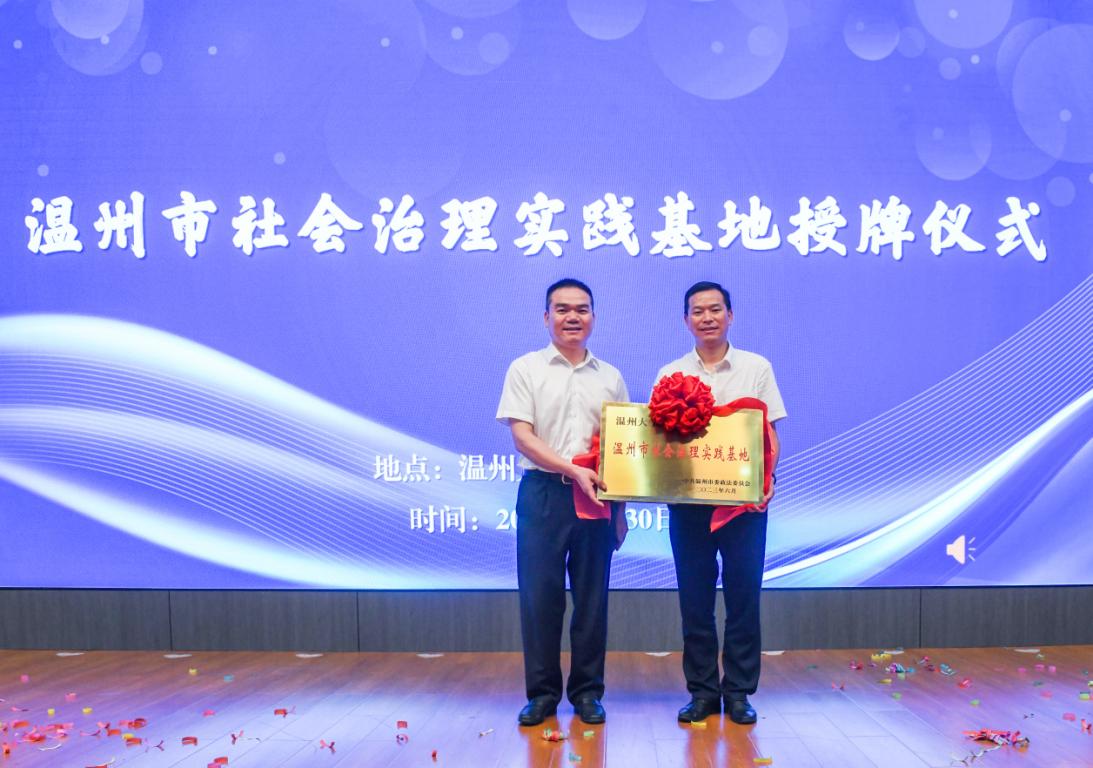 黄建斌为太阳集团tyc234cc授温州市社会治理实践基地牌,教育学院党委书记、社会心理服务中心主任何毅教授接牌。