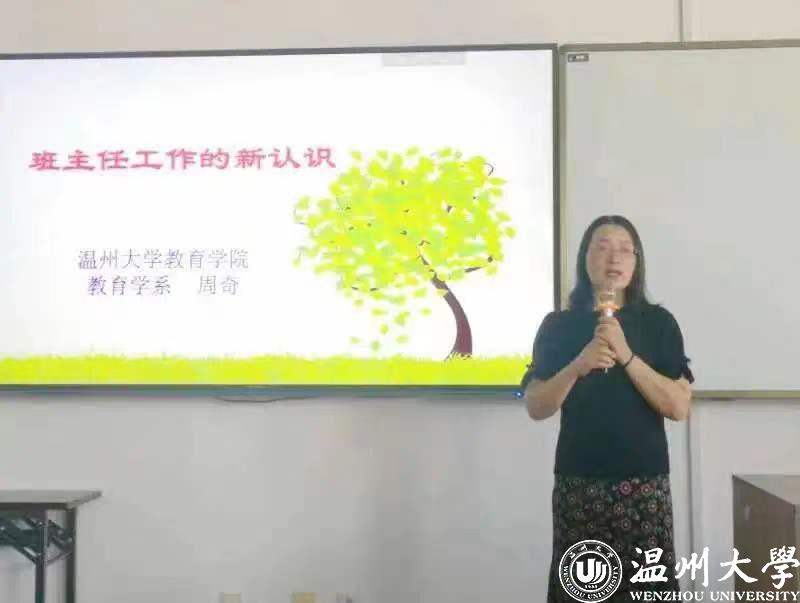 当天下午,周奇教授做《班集体建设的思考》专题讲座。周教授讲到,班级要有集体成员认同的共同奋斗目标,要有坚强而有威信的领导核心力量,要有正确的集体舆论和良好班风,以及健全的组织和严格的规章制度。她以毕淑敏的文章《谁是你最重要的人》引出班主任的意义:班主任是学生全面健康成长的导师,是班集体的组织者、教育者和指导者,是教学的骨干力量,更是沟通学校与家庭、社会教育的桥梁和纽带。随后,大家倾听了六位学员分享的“我的带班经验”,大家从同伴的故事中汲取经验,感受班级建设过程中的智慧。