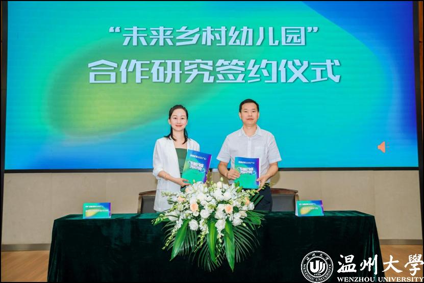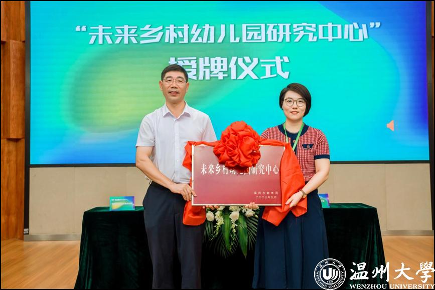 市学前教育指导中心主任陈苗和温大教育学院党委书记何毅分别代表市学前教育指导中心和温大教育学院进行“未来乡村幼儿园”合作研究签约。温州市教育局在温大教育学院设立“未来乡村幼儿园研究中心”并向院方代表授牌。