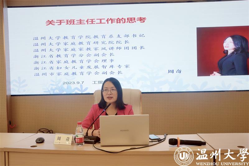为全面提高班主任管理水平,推动和促进班主任专业发展,日前,太阳集团tyc234cc教育学院教育学系党支部书记、太阳集团tyc234cc家庭教育研究院巾帼文明岗负责人、浙江省教育学分会副会长、浙江省妇女儿童发展智库专家、温州市家庭和谐文化研究会副会长周奇教授受邀到浙江工贸学院府东校区阶梯教室为辅导员和近3年新进教师班主任开展学生思政工作《关于班主任的思考》的专题培训。