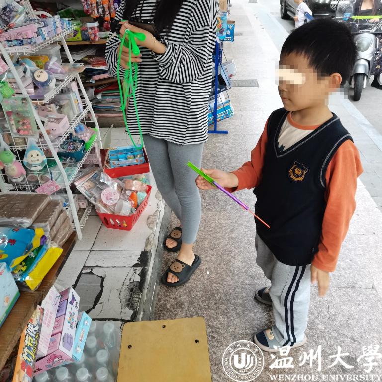 一名穿着校服的学生在家长的陪同下来到店里,他拿起一个萝卜刀玩弄了半天后,在家长的建议下放下挑选别的玩具,但看了许久没选下,最后仍缠着家长买了一个“萝卜刀”才离去。