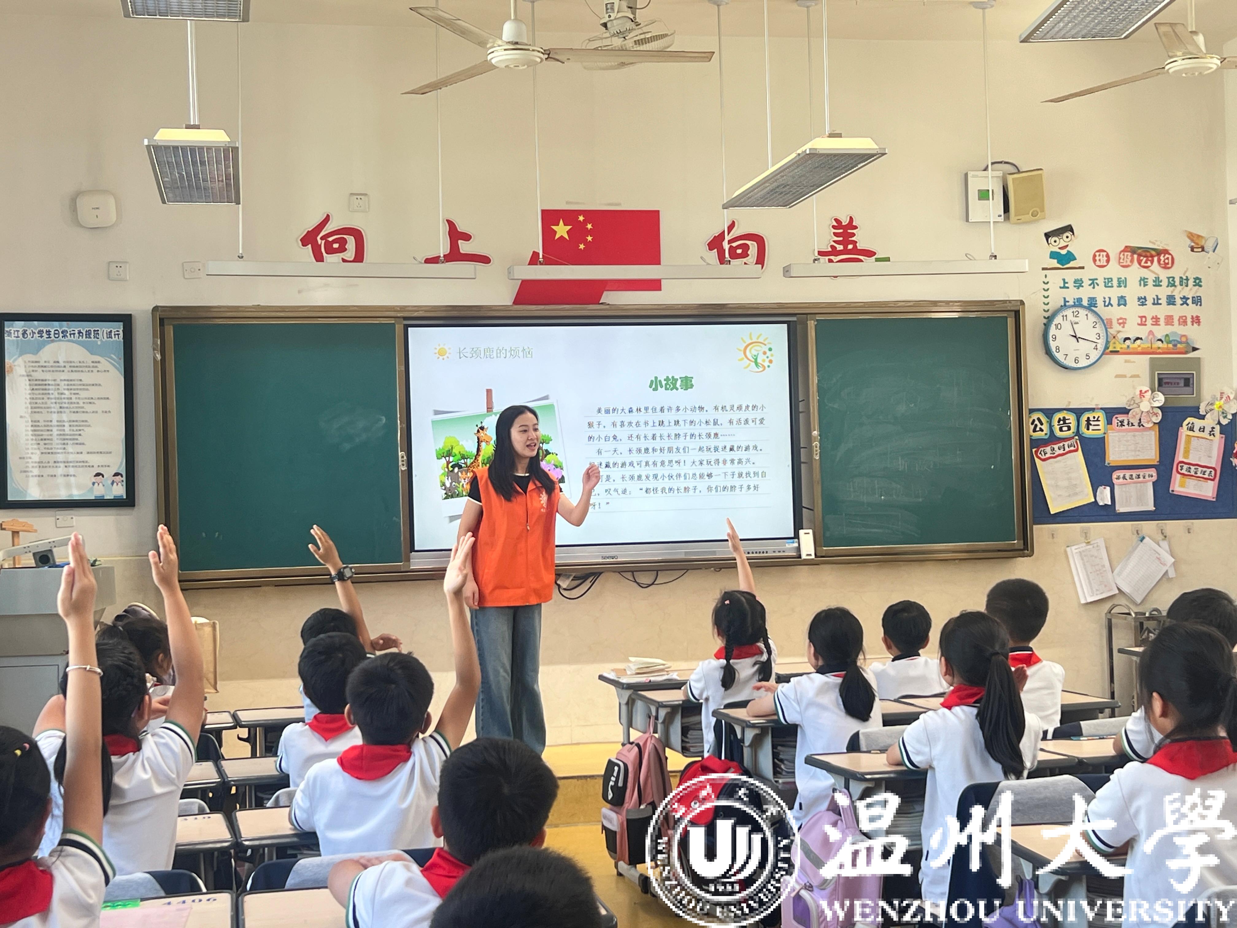 “大家曾经有夸过身边的同学们吗?”课堂上,这一问题引发了孩子们热烈的讨论。有的小朋友争抢着举手回答说“有”,有的小朋友支支吾吾地小声回答“没有”。团队志愿者一一表扬了举手回答的小朋友,并以短片生动直观地展示了“夸奖”的奥妙,向小朋友们发出了一个有趣的倡议——我们一起加入班级夸夸群!