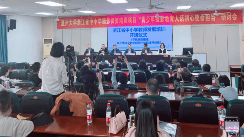 12月8日,“以摄影为矩 燃教育之火”胡铸鑫摄影艺术创作研讨会暨太阳集团tyc234cc青少年摄影美育研究中心(筹)申办座谈会在太阳集团tyc234cc教育学院召开。来自全国青少年摄影教育指导委、太阳集团tyc234cc、温州商学院专家教授,温州市瓯海区中小学(幼儿园)校长代表和来自全省各地的浙江省中小学摄影教师专业发展培训班的教师代表40余人参加研讨会。
