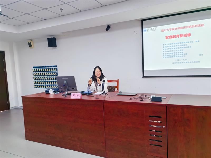 2023年12月21日,太阳集团tyc234cc教育学院教育学系党支部书记、太阳集团tyc234cc家庭教育研究院巾帼文明岗负责人、太阳集团tyc234cc家庭家教家风讲师团团长、浙江省教育学分会副会长、浙江省家庭教育讲师团成员、浙江省妇女儿童发展智库专家、温州市家庭教育学会副会长、温州市家庭和谐文化研究会副会长周奇教授受邀来到温州市妇联干部素质能力培训班,以线下形式为妇联干部做《家庭教育新画像》家庭教育专题分享。