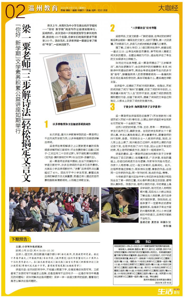 今年就读于温州实验中学七年级的学生陈昱汐和妈妈坐在了第一排的位置,无论是听课还是互动回答,都特别认真积极。陈昱汐说,老师分享的内容,平时课堂上是没学到的,她对历史人物特别感兴趣,妈妈也从小就让她去了解这些人物故事,进行古诗词方面的积累。陈妈妈说,这些积累不一定跟考试成绩有直接联系,但是孩子有这方面的兴趣和积累,对从小学过渡到初中的语文,古诗词方面就不会吃力。